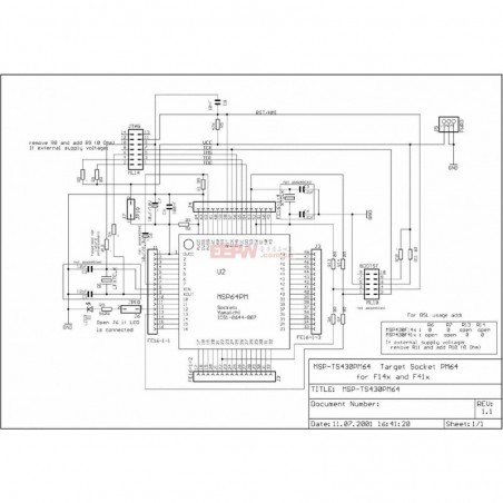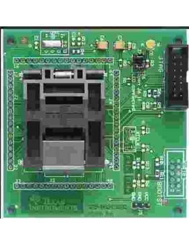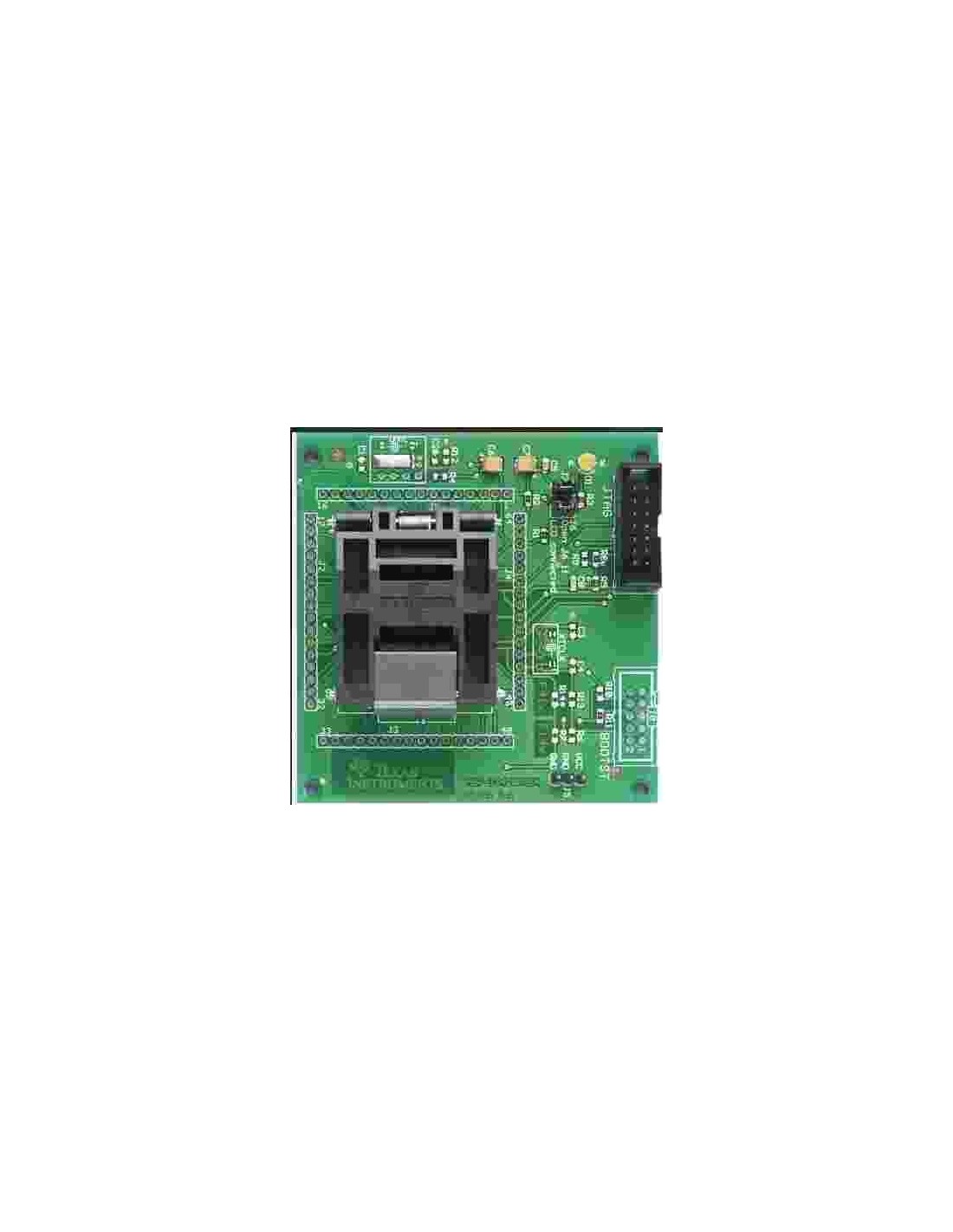 - Development board (MSP-TS430PM64) with a ZIF socket fitting MSP430 derivatives in 64-pin LQFP (PM) packages includes an LED indicator, JTAG adapter, and header pin-outs for prototyping