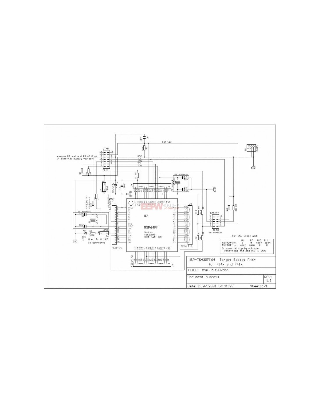 Device Support: The MSP-TS430PM64 development board supports MSPF13x, MSP430F14x, MSP430F14x1, MSP430F15x, MSP430F16x, MSP430F23x, MSP430F24x, MSP430F24xx, MSP430F261x, MSP430F41x (except for MSP430F41x2 MCUs: see MSP-TS430PM64A instead), MSP430F42x, MSP430F42xA, MSP430E42x, MSP430FE42xA, MSP430FE42x2 and MSP430FW42x MCUs in a 64-pin LQFP package (TI package code: PM).