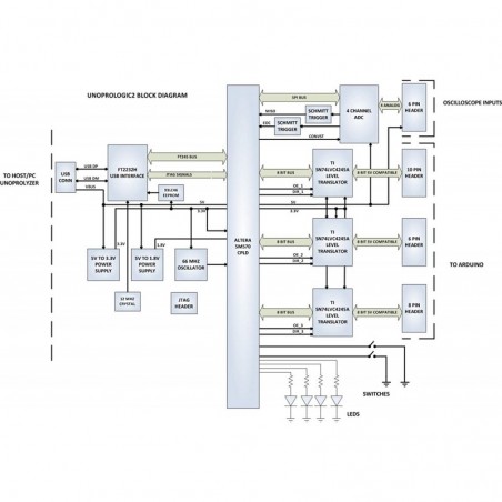 | The UnoProLogic makes programmable logic easy with an all inclusive development platform. It includes an Altera 5M570 CPLD, JTAG programmer, and a four channel ADC with 300KS/second sample rate. You can create your HDL code, program it into the CPLD and interact with the hardware via a Windows PC. |