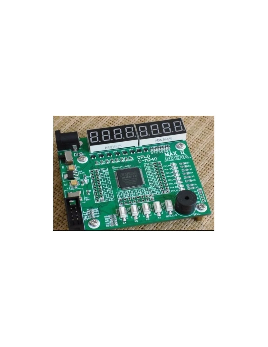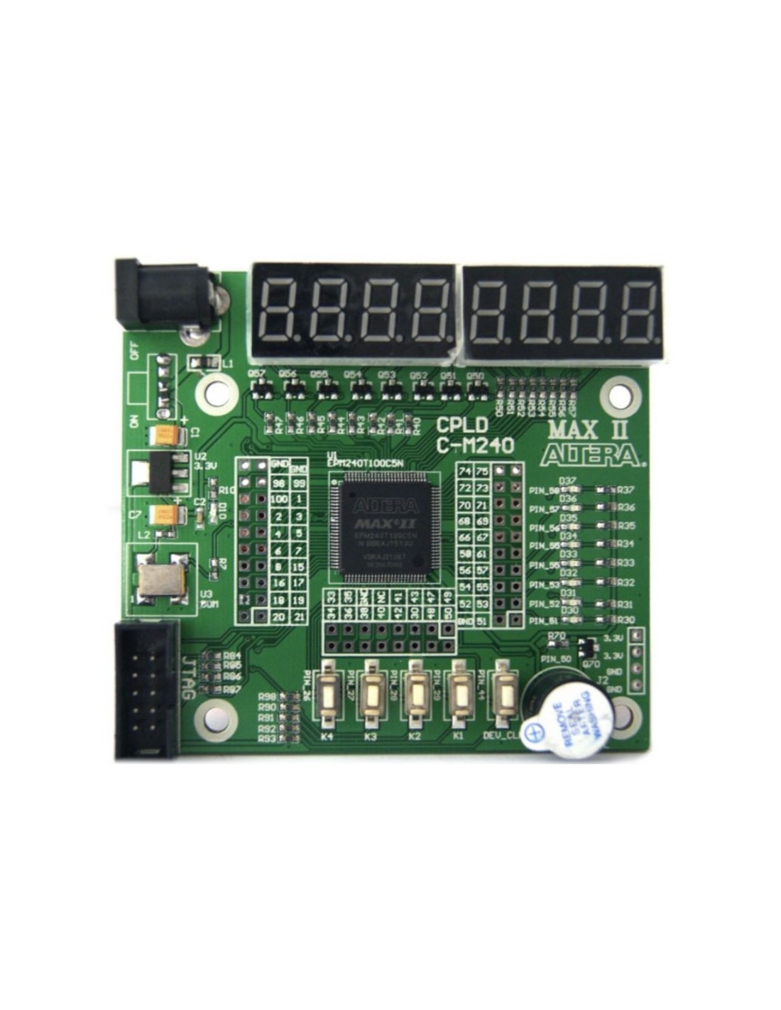 MAXII CPLD C-M240 development card for the EPM240T100C5 OEM with seven segment displays, indicator LEDs and buttons for basic tests. The card can be programmed with VHDL or Verilog through the JTAG port. The card has a 50Mhz crystal and through the pins you have access to 50 input / output ports.