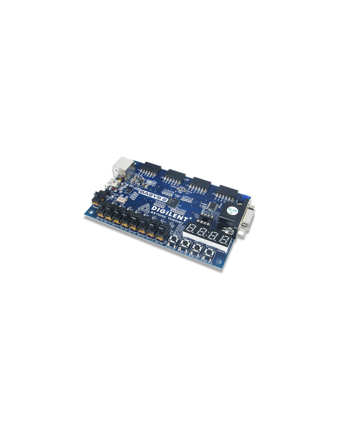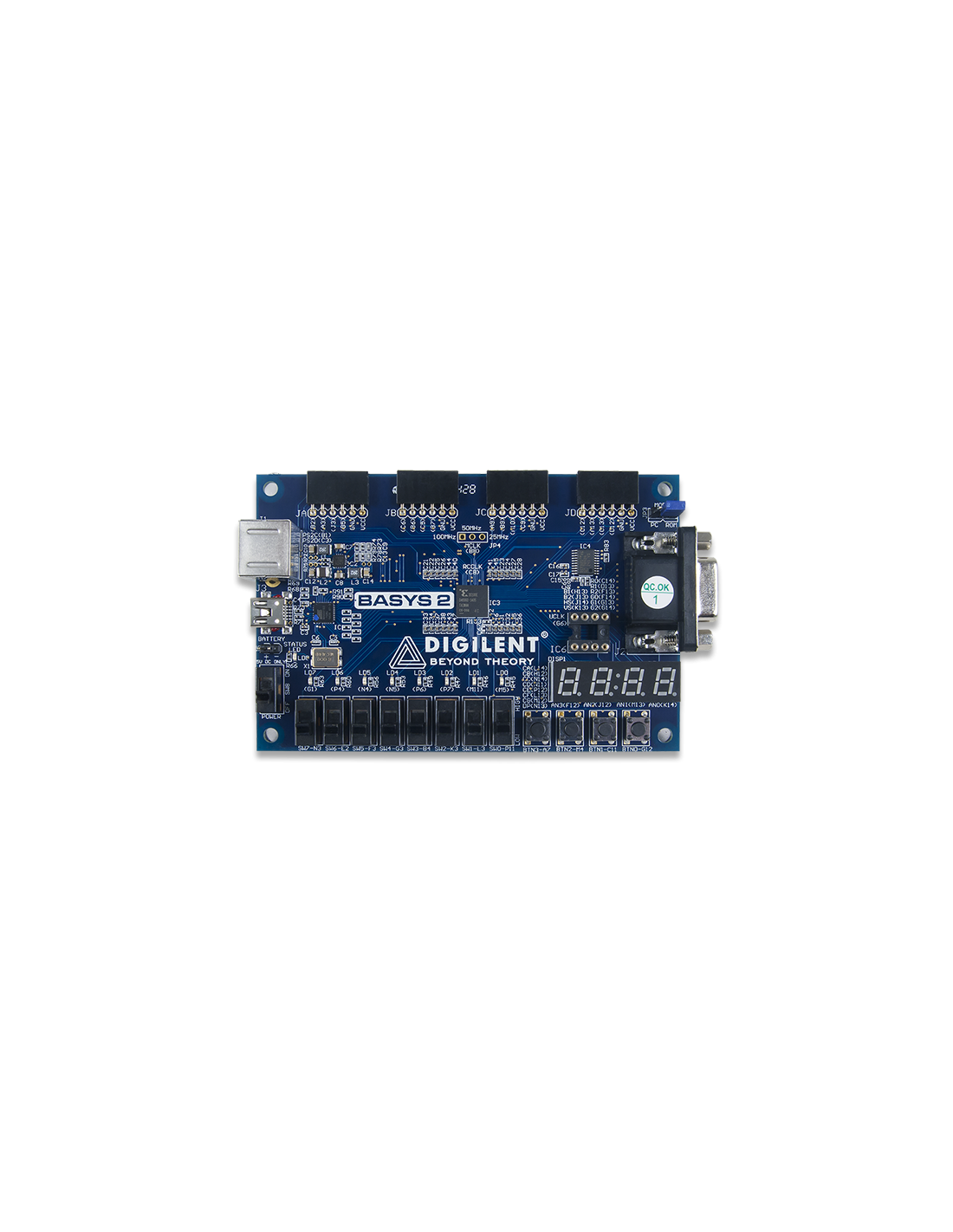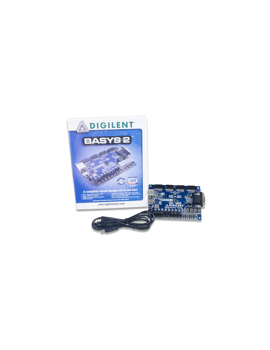 The Basys 2 FPGA development board is a circuit design and implementation platform for beginners to gain experience building real digital circuits. Built around a Xilinx® Spartan®-3E FPGA and an Atmel® AT90USB2 USB controller, the Basys 2 development board provides complete, ready-to-use hardware suitable for hosting circuits ranging from basic logic devices to complex controllers. A large collection of on-board I/O devices and all required FPGA support circuits are included, so countless designs can be created without the need for any other components.