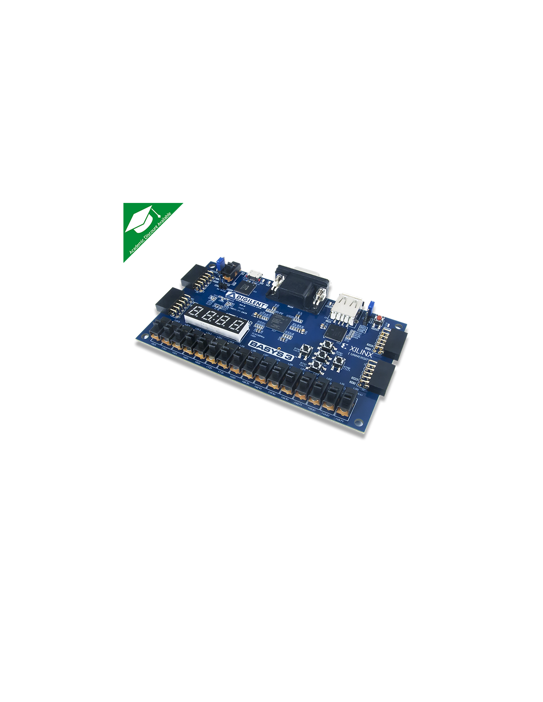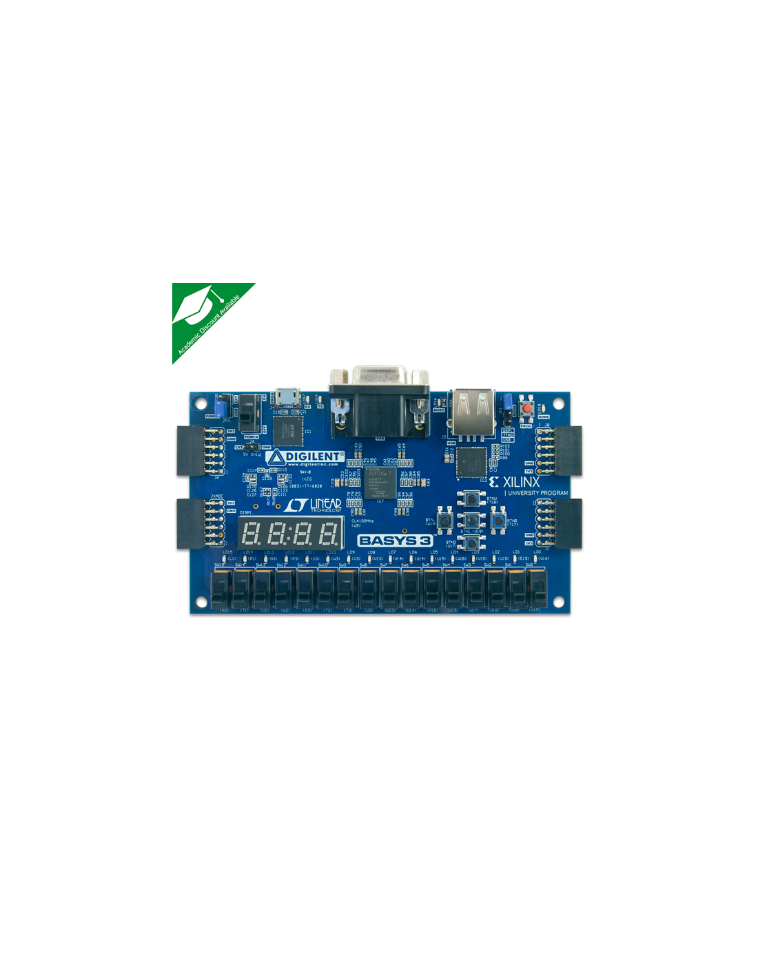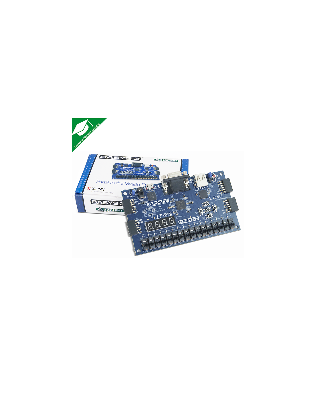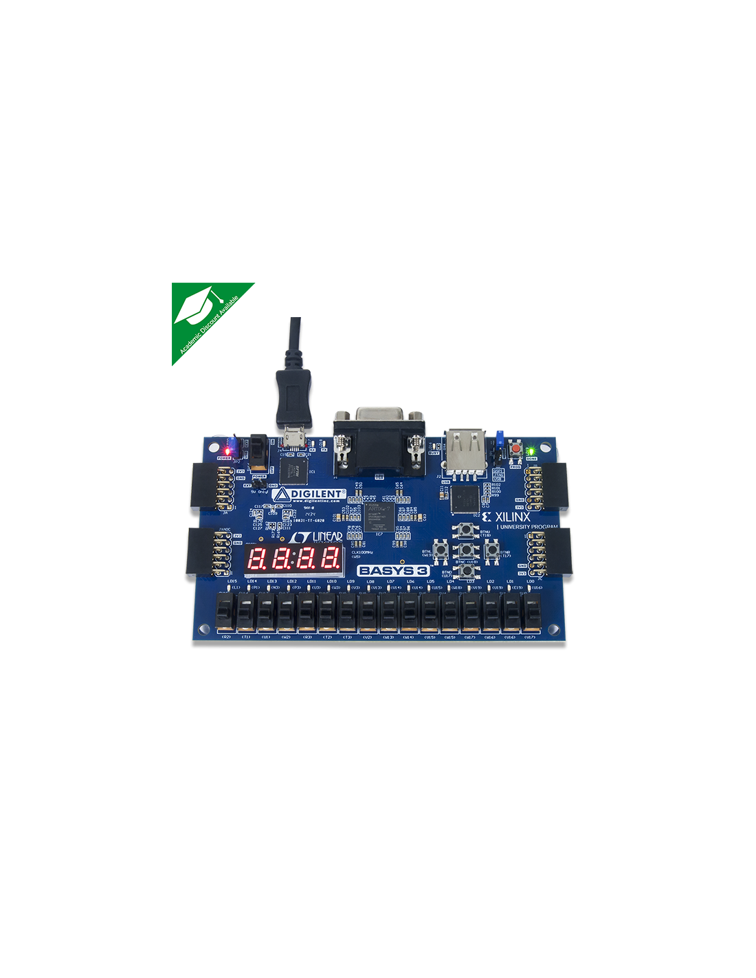The Basys 3 is an entry-level FPGA development board designed exclusively for Vivado Design Suite, featuring Xilinx Artix-7 FPGA architecture. Basys 3 is the newest addition to the popular Basys line of FPGA development boards, and is perfectly suited for students or beginners just getting started with FPGA technology. The Basys 3 includes the standard features found on all Basys boards: complete ready-to-use hardware, a large collection of on-board I/O devices, all required FPGA support circuits, a free version of development tools, and at a student-level price point.