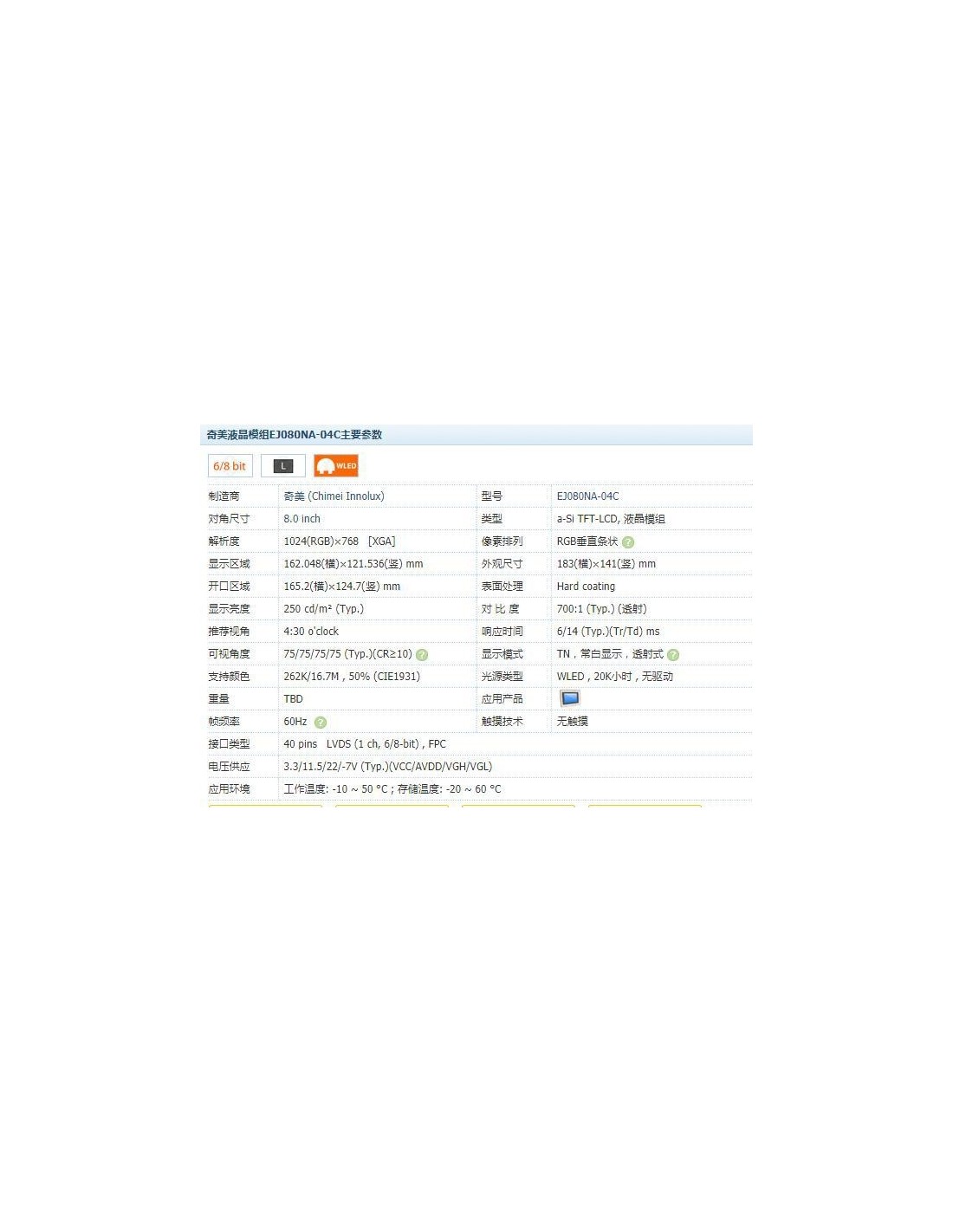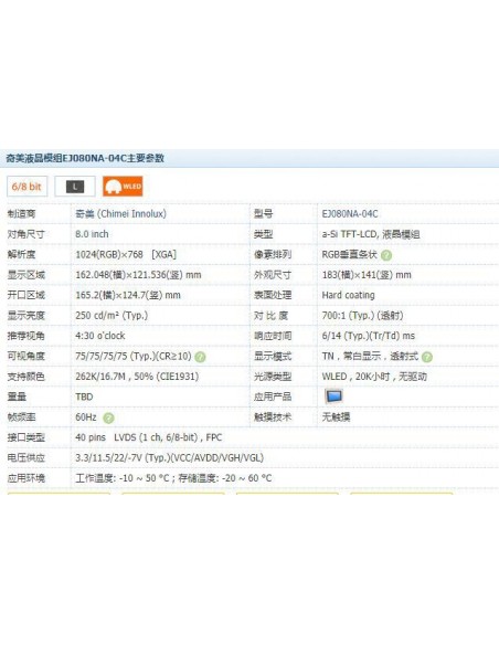 KW080NA-04B Display 8.0" (135x174mm) 3mm LCD TFT 1024x768 Tablet displays
