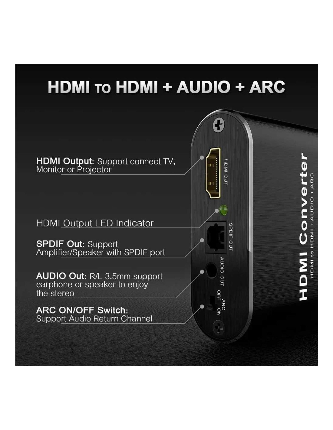 O conversor de áudio 4K HDMI Extrai o sinal de áudio da fonte de vídeo HDMI. O extrator de áudio suporta áudio estéreo analógico, bem como fluxos de áudio multicanal de alta definição sobre a saída de áudio óptico digital.