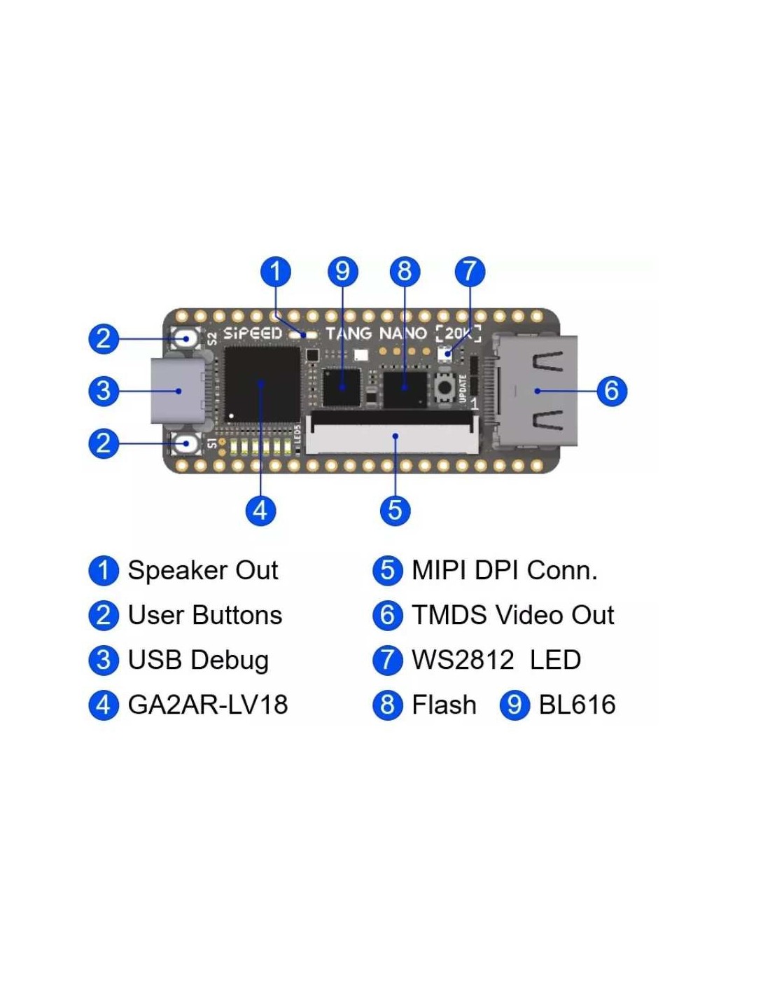 Tang Nano 20K is a development board, using the GW2AR-18 QN88 FPGA, containing 20736 LUT4 logic cells and 15552 Filp-Flops. There are 2 PLL in this FPGA chip, and many DSP units supporting 18 bit x 18 bit multiplication. Onboard BL616 is used for downloading bitstream into FPGA, and it's also used as USB to serial convertor to communicate FPGA with computer via UART. The 27MHz crystal generates the clock for HDMI display, onboard MS5351 clock generating chip also provides mutiple clocks.