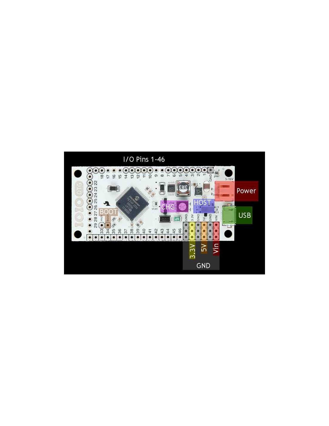 A switch on the board can be used to force the IOIO-OTG into host mode, but most of the time the board can be left in 'auto' mode and it will detect its role in the connection. We're now shipping the IOIO-OTG board loaded with the V4.02 bootloader and the V5.06 application firmware. New application firmware is frequently released, and can be upgraded without needing a programmer using the IOIODude application. Additionally, this version of the IOIO-OTG has corrected the IC power failure issue due to the on-board switch voltage regulator failing as well as adding a missing decoupling cap on the AVIN pin. This new IOIO-OTG has fixed the problems that plagued the previous version making it a true vision of how the board is intended! You can find out more about these updates here.