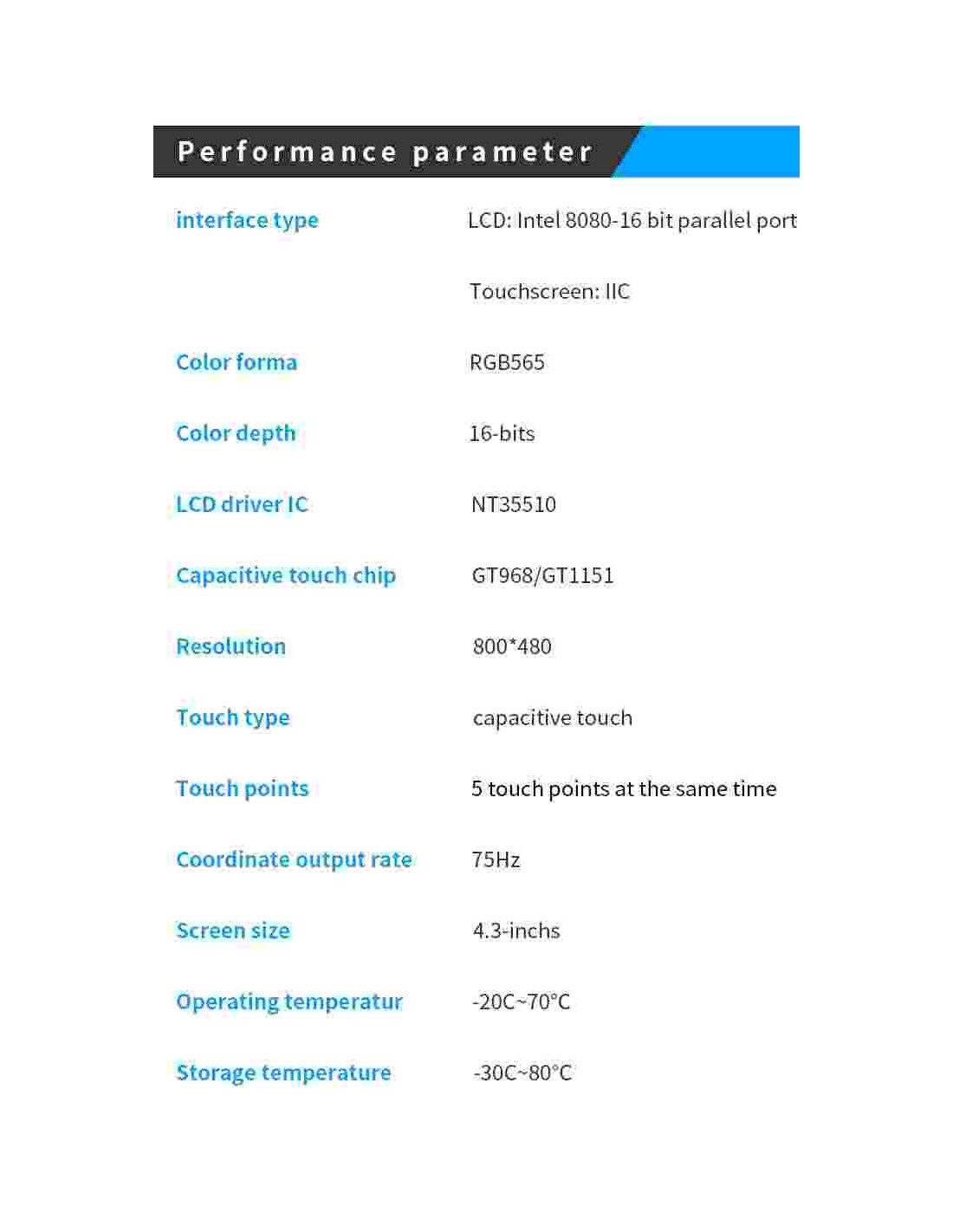 Type of interface: LCD: lntel8080-16-bit parallel port | touch screen: IIC
