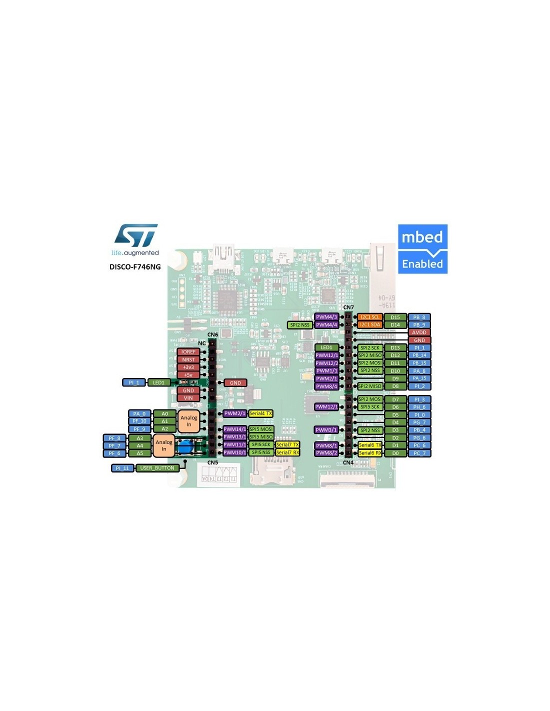 - STM32F746NGH6 microcontroller featuring 1 Mbytes of Flash memory and 340 Kbytes of RAM, in BGA216 package